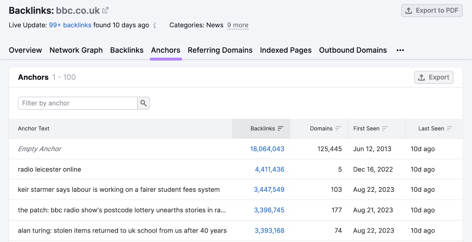 For example, Semrush’s Backlink Analytics tool shows that bbc.co.uk has backlinks from over 1 million domains. Including reputable sites like cdc.gov, microsoft.com, and britannica.com.