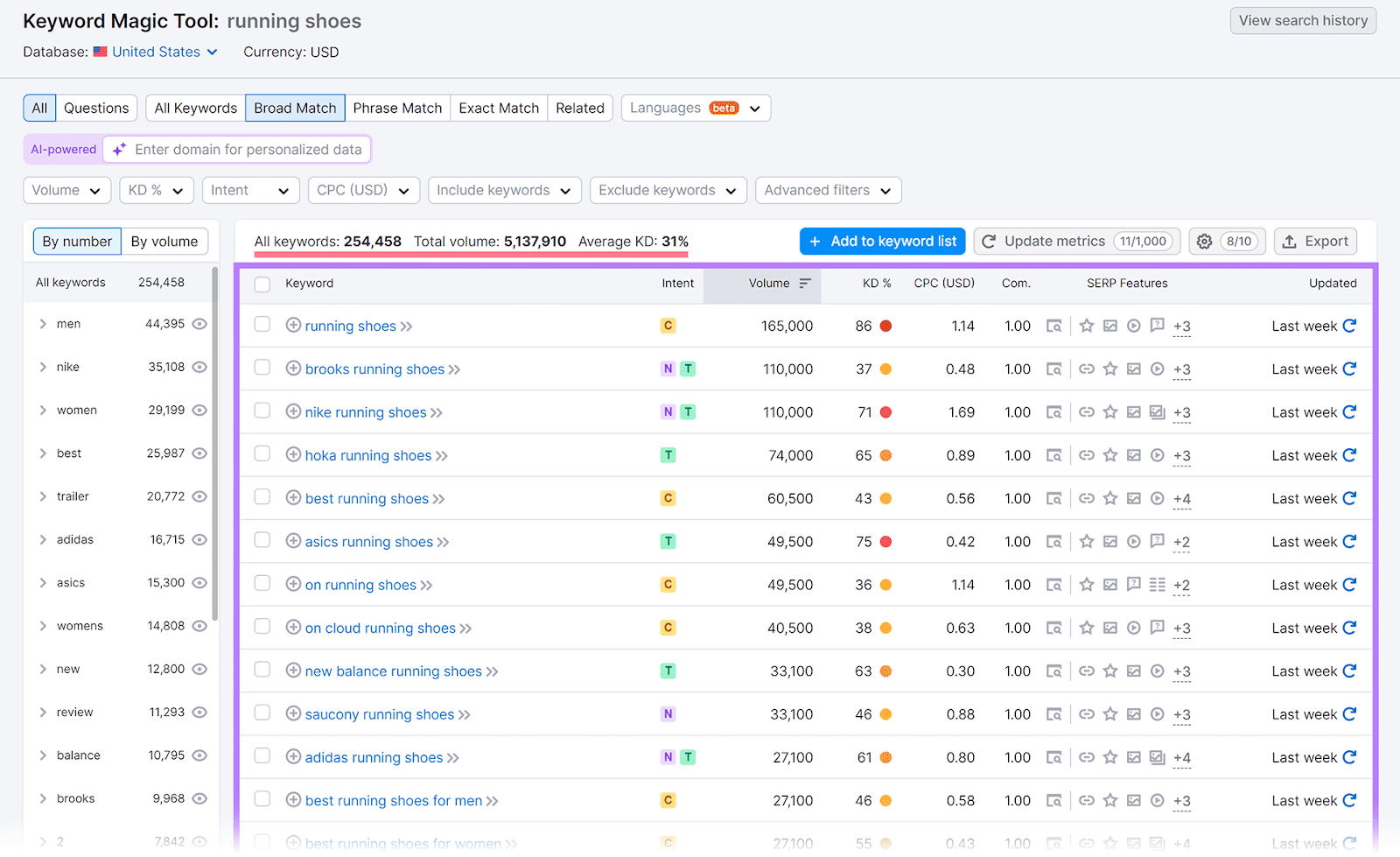 This will return a list of related keyword suggestions. We searched for “running shoes.” And got a list of over 254K keyword suggestions.