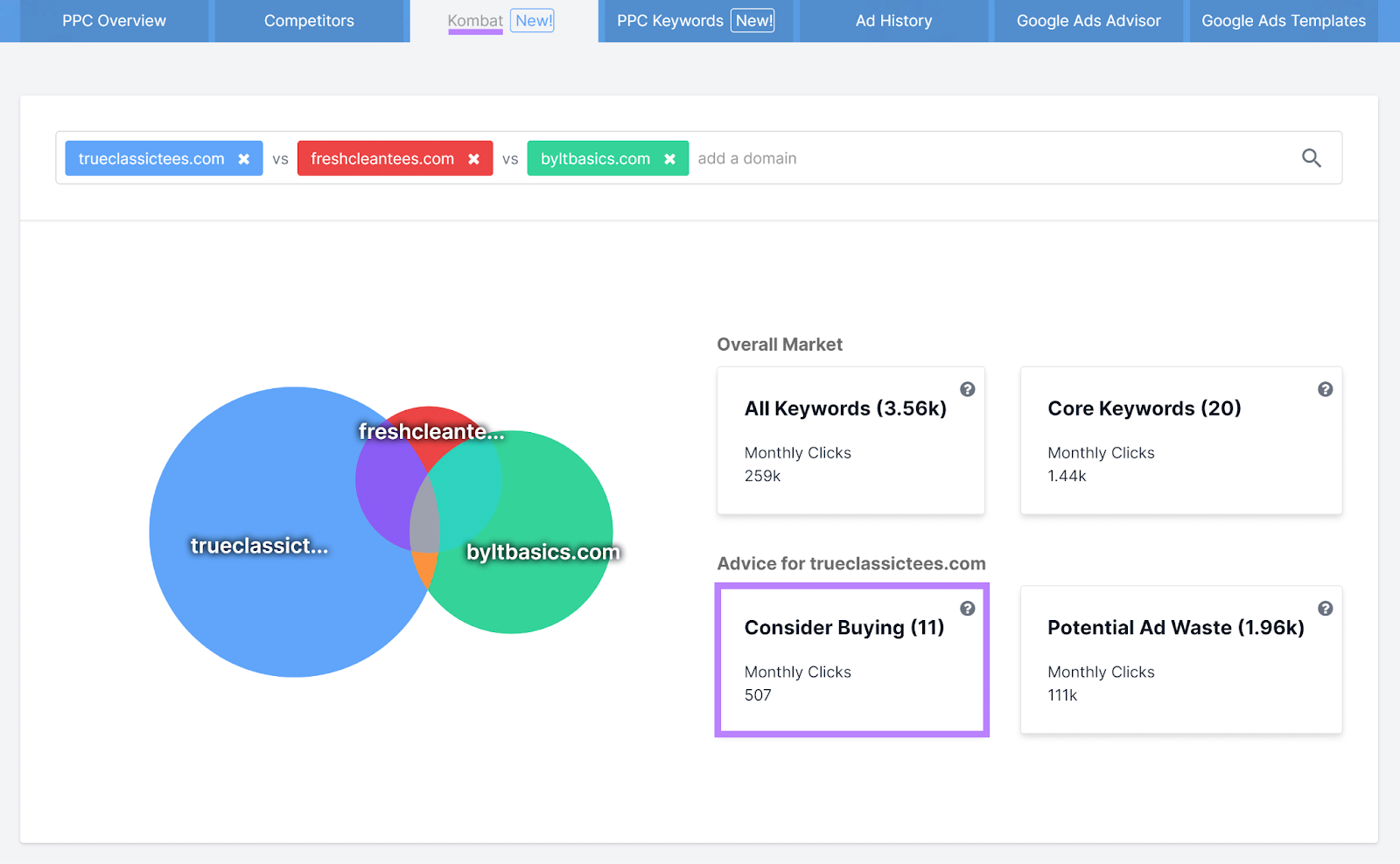 This report includes data like the domain’s total number of unique paid keywords, its estimated number of monthly PPC clicks, and an estimate of its monthly PPC spend.