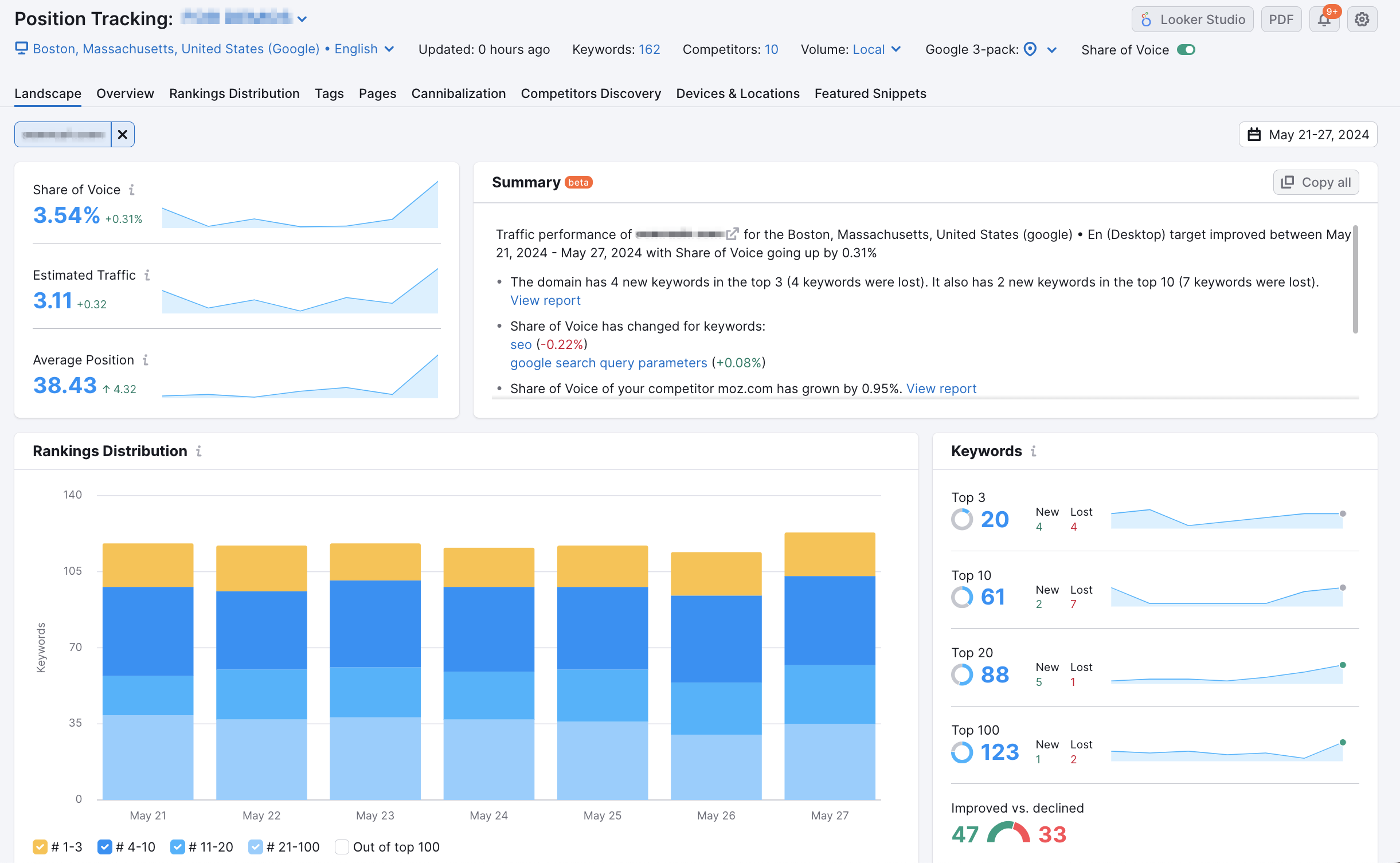 Position Tracking is the easiest way to track how any SEO or PPC efforts are performing. The visibility score, estimated traffic, and average position metrics make monitoring and reporting progress simple and transparent.